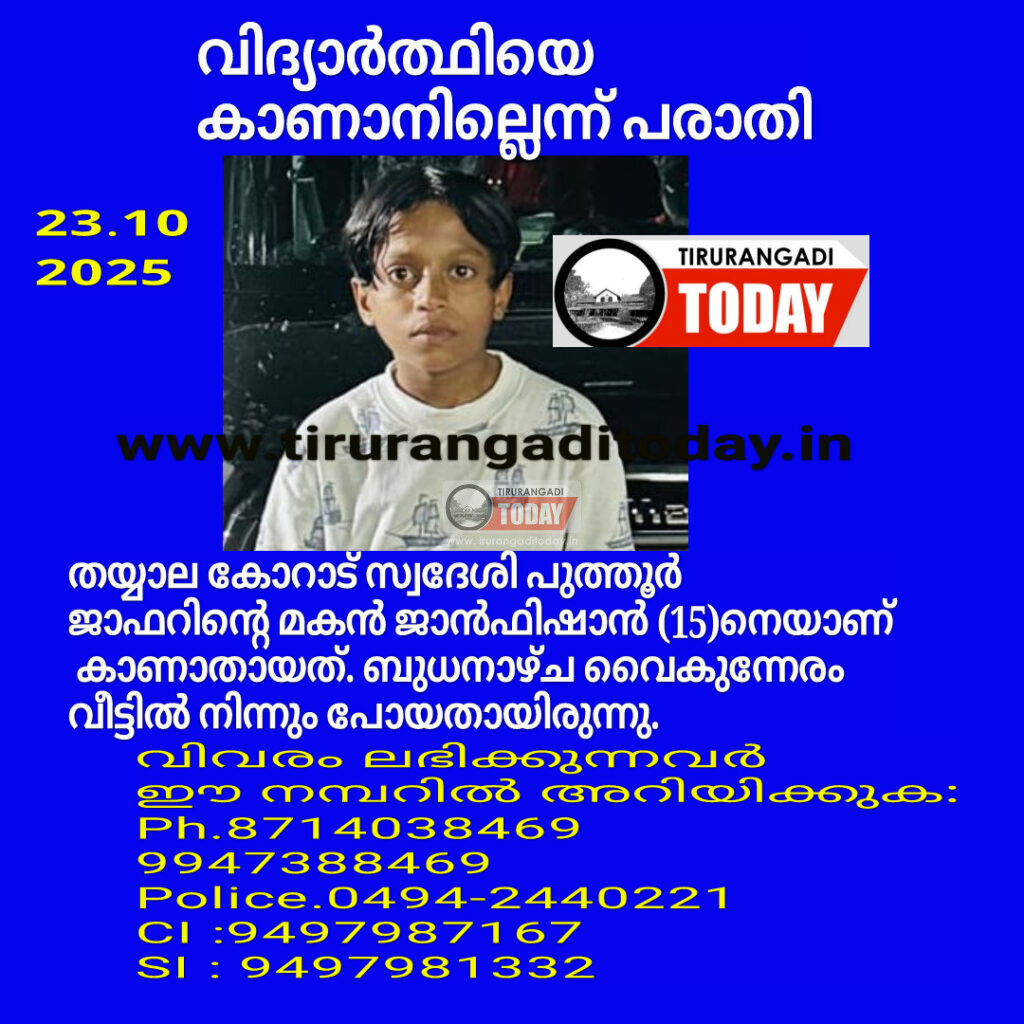 താനൂർ: വിദ്യാർത്ഥിയെ വീട്ടിൽ നിന്നും കാണാതായതായി പരാതി. ഒഴുർ തയ്യാല കോറാട് സ്വദേശി പുത്തൂർ ജാഫറിൻ്റെ മകൻ ജാൻഫിഷാൻ എന്ന 15 വയസുകാരനെയാണ് കാണാതായത്. ബുധനാഴ്ച വൈകുന്നേരം വീട്ടിൽ നിന്നും പോയതായിരുന്നു.