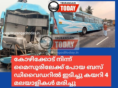 ബെംഗളൂരു: മൈസൂരുവിന് സമീപം ചന്നപ്പട്ടണ മദ്ടൂരിൽ കേരളത്തിൽ നിന്നുള്ള സ്വകാര്യ ബസ് അപകടത്തിൽപ്പെട്ടു നാല് പേർ മരിച്ചു. ഇന്ന് പുലർച്ചെ 4.10 ഓടെ ബെംഗളൂരു- മൈസൂരു എക്സ്പ്രസ് പാതയിൽ പുട്ടപ്പനദുഡിയിലാണ് അപകടം ഉണ്ടായത്. കോഴിക്കോട് നിന്ന് ബെംഗളൂരുവിലേക്ക് വരികയായിരുന്ന പി കെ ട്രാവൽസിൻ്റെ സ്ലീപ്പർ ബസാണ് അപകടത്തിൽ പെട്ടത്. ബസ് ഡിവൈഡറിൽ ഇടിച്ചുകയറി മറിയുകയായിരുന്നു. മരിച്ച നാലുപേരും മലയാളികളാണ്. കൊയിലാണ്ടി സ്വദേശി മുഹമ്മദ് ഫർഹാൻ, റഷീദ്, സക്കീർ, മാഹി സ്വദേശി സുൽഫിക്കർ എന്നിവരാണ് മരിച്ചത്.