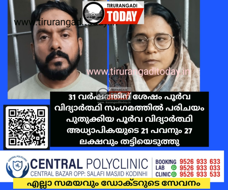 പരപ്പനങ്ങാടി : 31 വർഷത്തിനുശേഷം നടന്ന പൂർവവിദ്യാർഥി സംഗമത്തിനെത്തി പരിചയം പുതുക്കിയയാൾ അധ്യാപികയുടെ 21 പവൻ സ്വർണ്ണവും 27.5 ലക്ഷം രൂപയും തട്ടി മുങ്ങി. ഒളിച്ചു താമസിക്കുകയായിരുന്ന ശിഷ്യനെയും ഭാര്യയെയും കർണാടക യിൽ നിന്ന് പൊക്കി പോലീസ്.