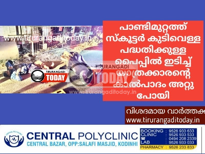 നന്നമ്പ്ര: കുടിവെള്ള പദ്ധതിക്ക് ഇറക്കി വെച്ച പൈപ്പിൽ സ്കൂട്ടർ ഇടിച്ച് യാത്രക്കാരൻ്റെ കാൽപാദം അറ്റുപോയി. പാണ്ടിമുറ്റം – കൊടിഞ്ഞി റോഡിൽ പാണ്ടിമുറ്റത്തിനും വെള്ളിയമ്പുറത്തിനും ഇടയിലുള്ള സി കെ പടിയിൽ ആണ് സംഭവം. യൂണിവേഴ്സിറ്റി സ്വദേശിയായ സജാദിനാണ് (37) പരിക്കേറ്റത്. ഇയാളെ കോഴിക്കോട് മെഡിക്കൽ കോളേജിൽ പ്രവേശിപ്പിച്ചു. ഇന്ന് പുലർച്ചെ 5 നാണു സംഭവം. താനൂർ നഗരസഭയുടെ കുടിവെള്ള പദ്ധതിക്കായി റോഡരികിൽ വലിയ പൈപ്പുകൾ ഇറക്കി വെച്ചിട്ടുണ്ട്. സ്കൂട്ടർ ഇതിൽ ഇടിച്ചാണ് അപകടം ഉണ്ടായത്. അപകടത്തിൽ സജാദിൻ്റെ ഇടത്തെ കാൽപാദം അറ്റു പോയിരുന്നു. ഏതാനും മീറ്ററുകൾ ദൂരേക്ക് തെറിച്ചു പോയിരുന്നു. സംഭവം ശ്രദ്ധയിൽ പെട്ടവർ വിവരമറിയിച്ചതിനെ തുടർന്ന് ആംബുലൻസ് എത്തി ആശുപത്രിയിലേക്ക് കൊണ്ടുപോകുകയായിരുന്നു.