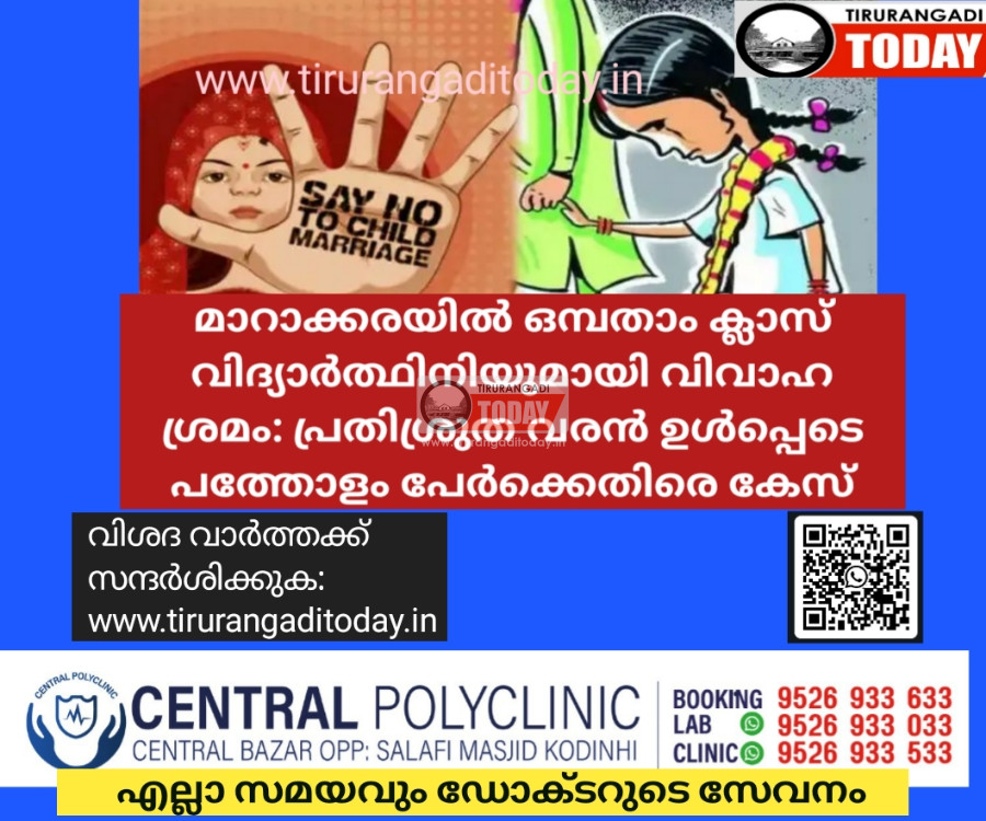 ഒമ്പതാം ക്ലാസിൽ പഠിക്കുന്ന പെൺകുട്ടിയുമായി വിവാഹം നിശ്ചയിച്ച സംഭവത്തിൽ പ്രതി ശ്രുത വരനടക്കം പത്തോളം പേർക്കെതിരെ ശൈശവ വിവാഹത്തിന് കേസ്. കാടാമ്പുഴ മാറാക്കര പഞ്ചായത്തിലെ മരവട്ടത്താണ് സംഭവം.