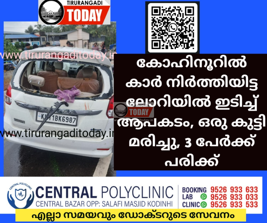 തേഞ്ഞിപ്പലം : യൂണിവേഴ്സിറ്റി കോഹിനൂറിൽ കാർ അപകടം, ഒരു കുട്ടി മരിച്ചു. നിർത്തിയിട്ടിരുന്ന ലോറിയിൽ കാറിടിച്ചാണ് അപകടം. ഒരു കുട്ടി തൽക്ഷണം മരിച്ചു. ആണ്കുട്ടിയാണ് മരിച്ചത്. 2 കുട്ടികൾ ഉൾപ്പെടെ 3 പേർക്ക് പരിക്കേറ്റു. കോഴിക്കോട് ഭാഗത്ത് നിന്ന് വരികയായിരുന്ന കാർ ആണ് അപകടത്തിൽ പെട്ടത്. ഇന്ന് ഉച്ചയ്ക്ക് ഒരു മണിയോടെയാണ് അപകടം. ലോറികൾ നിർത്തിയിടുന്ന സ്ഥലത്തിന് സമീപമാണ് അപകടം.