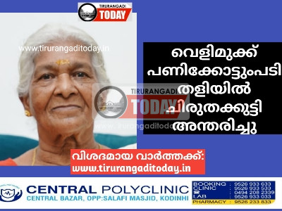 മൂന്നിയൂർ : വെളിമുക്ക് പണിക്കോട്ടുംപടി തളിയിൽ ചിരുതക്കുട്ടി (77) അന്തരിച്ചു. ഭർത്താവ്: പരേതനായ നായടി. മക്കൾ: പരേതയായ പത്മിനി, രാമചന്ദ്രൻ, പ്രകാശൻ, ശാന്ത, പ്രേമ, സുരേന്ദ്രൻ, ഗംഗാധരൻ. മരുമക്കൾ: മോഹനൻ (ഒലിപ്രം), ഗംഗാധരൻ (കാക്കഞ്ചേരി), ബാബു ( ഇടിമുഴിക്കൽ), ബിന്ദു, ഷാനി, സജിനി,രേഷ്മ. സഞ്ചയനം ശനിയാഴ്ച.