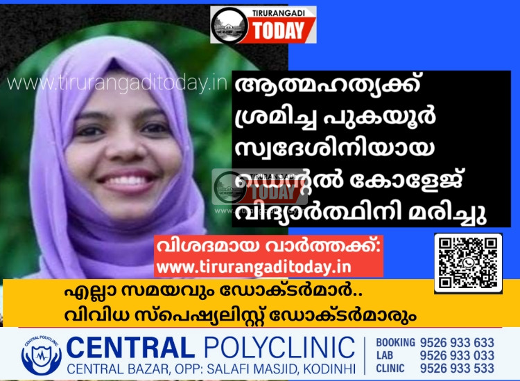 തിരൂരങ്ങാടി : കോഴിക്കോട് : ഗവ.ഡെൻ്റൽ കോളജ് ഹോസ്റ്റലിൽ ആത്മഹത്യക്ക് ശ്രമിച്ച പുകയൂർ സ്വദേശിയായ ഡെൻ്ൽ പിജി ഒന്നാം വർഷ വിദ്യാർഥിനി മരണപ്പെട്ടു. എ ആർ നഗർ പുകയൂർ ഒളകര സ്വദേശി അണ്ണങ്ങാടൻ മുസ്തഫയുടെ മകൾ സഹല ബീഗം (27) ആണ് മരിച്ചത്. കോഴിക്കോട് ഗവണ്മെന്റ് ഡെന്റൽ കോളേജിലെ