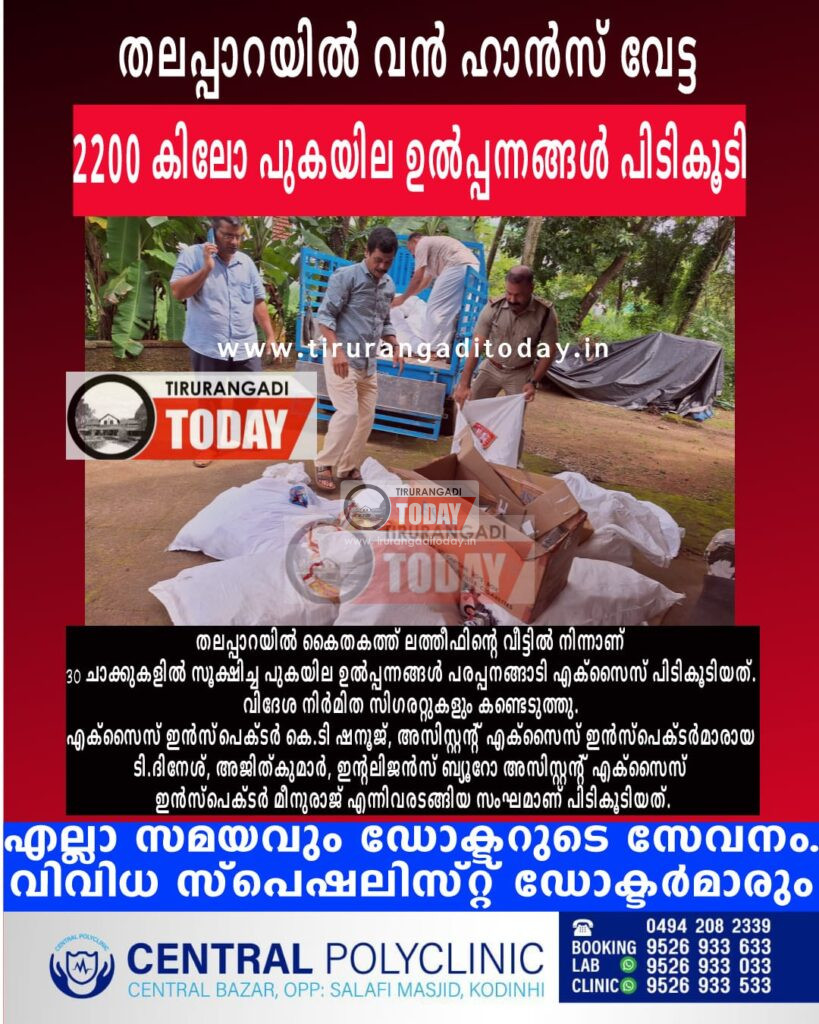 തിരൂരങ്ങാടി : തലപ്പാറയിൽ വൻ ഹാൻസ് ശേഖരം പിടികൂടി. 30 ചാക്കുകളിയായി സൂക്ഷിച്ചിരുന്ന പുകയില ഉൽപ്പന്നങ്ങൾ ആണ് പിടികൂടിയത്. തലപ്പാറ ജങ്ഷന് സമീപത്തെ വീട്ടിൽ സൂക്ഷിച്ചിരുന്ന പുകയില ഉൽപ്പന്നങ്ങൾ ആണ് പരപ്പനങ്ങാടി എക്സൈസ് സംഘം പിടികൂടിയത്. കൈതകത്ത് ലത്തീഫ് എന്നയാളുടെ വീട്ടിൽ നിന്നാണ് ശേഖരം പിടികൂടിയത്. 30 ചാക്കുകളിയായി 2200 കിലോ പുകയില ഉൽപ്പന്നങ്ങൾ ഉണ്ടായിരുന്നു. വൻ റാക്കറ്റാണ് ഇതിന് പിന്നിൽ പ്രവർത്തിക്കുന്നതെന്നും ജില്ലയിൽ പുകയില ഉത്പ്പന്നങ്ങൾ വിതരണം ചെയ്യുന്ന മൊത്തവില്പനക്കാരിൽ ഒരാളാണ് പിടിയിലായതെന്നും ഇൻസ്‌പെക്ടർ പറഞ്ഞു.