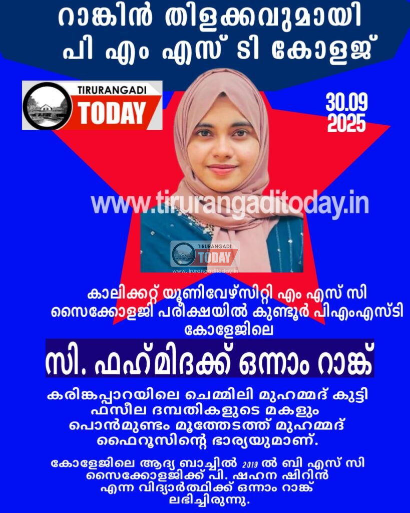 റാങ്കിൻ തിളക്കവുമായി കുണ്ടൂർ പിഎംഎസ്ടി കോളേജ്; എം എസ് സി സൈക്കോളജിയിൽ ഫഹ്മിദക്ക് ഒന്നാം റാങ്ക്