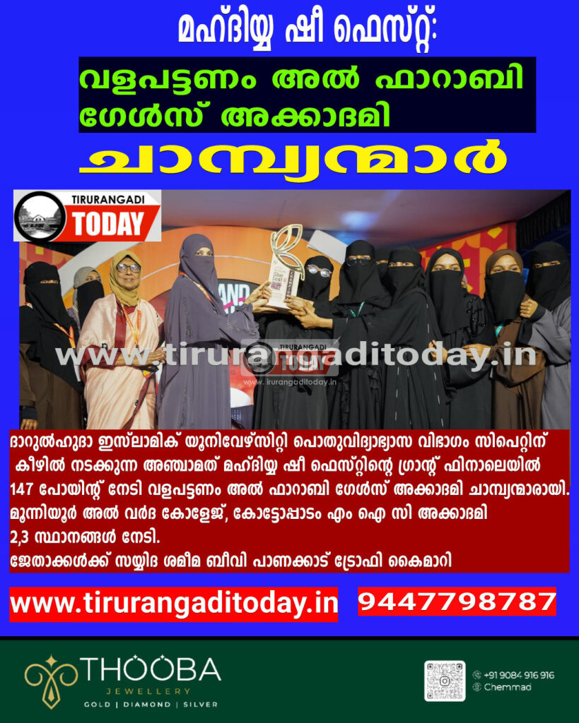 തിരൂരങ്ങാടി (ഹിദായ നഗര്): അഞ്ചാമത് മഹ്ദിയ്യ ഷീ ഫെസിറ്റിന് ഇന്നലെ ഹിദയാ നഗറില് പ്രൗഢ സമാപ്തി. ഥാനവിയ്യ, ആലിയ, കുല്ലിയ വിഭാഗങ്ങളിലായി നടന്ന ഫെസ്റ്റില് 147 പോയിന്റുമായി അൽ ഫാറാബി ഗേൾസ് അക്കാദമി വളപട്ടണം ചാമ്പ്യന്മാരായി. 112, 91 പോയിന്റുകളുമായി അൽ വർദ വിമൻസ് കോളേജ് മൂന്നിയൂർ, എം.ഐ.സി വിമൻസ് അക്കാദമി കോട്ടോപ്പാടം എന്നിവർ യഥാക്രമം രണ്ടും മൂന്നും സ്ഥാനങ്ങള് നേടി.