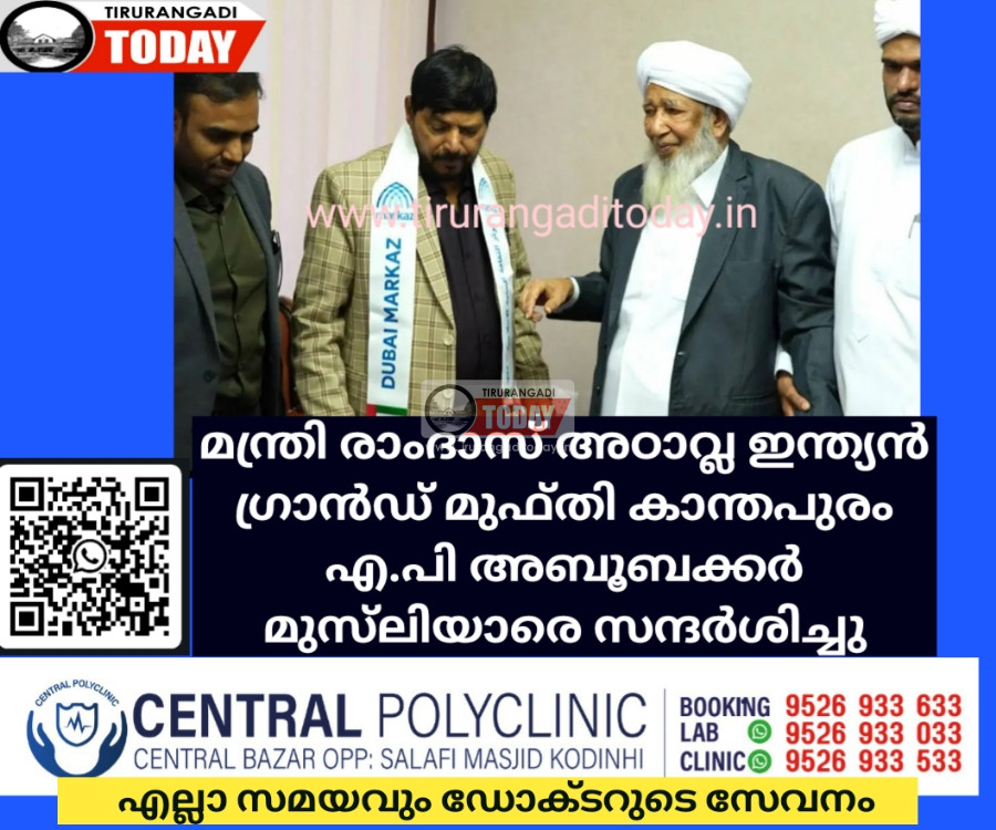 ദുബായ് : കേന്ദ്ര സാമൂഹിക നീതി, ശാക്തീകരണ മന്ത്രി രാംദാസ് അഠാവ്ല ഇന്ത്യൻ ഗ്രാൻഡ് മുഫ്തി കാന്തപുരം എ.പി അബൂബക്കര് മുസ്ലിയാരെ ദുബായ് മര്കസ് ഓഫീസില് സന്ദര്ശിച്ചു. മര്കസിന്റെ സാമൂഹിക സേവന പ്രവര്ത്തനങ്ങള് മാതൃകാപരമാണെന്ന് മന്ത്രി പറഞ്ഞു. ഉടന്തന്നെ കോഴിക്കോട്ടെ കരന്തൂര് മര്കസ് നേരിട്ട് സന്ദര്ശിക്കുമെന്നും അദ്ദേഹം അറിയിച്ചു.