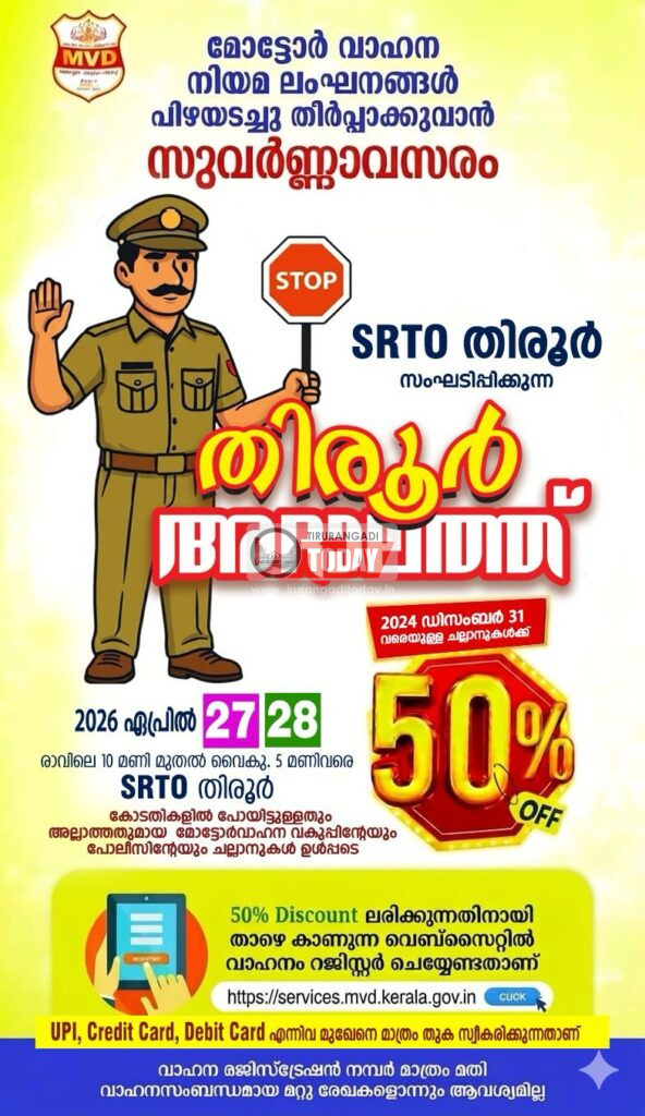 തിരൂരങ്ങാടി: മോട്ടോർ വാഹന നിയമലംഘനങ്ങൾ പ്രകാരം പിഴ ലഭിച്ചിട്ടും അടയ്ക്കാനാവാതെ വന്നവർക്ക് 50 ശതമാ നം ആനുകൂല്യത്തോടെ അവ അടച്ചു തീർക്കാൻ മെഗാ അദാലത്ത് തിരൂരങ്ങാടി സബ് ആർടിഒ ഓഫീസിൽ വരുന്നു ഈ മാസം ഇരുപത്തി ഏഴാം തീയതി തിങ്കളാഴ്ച മുതൽ മുപ്പതാം തീയതി വ്യാഴാഴ്ച വരെയാണ് മെഗാ അദാലത്ത് സംഘടിപ്പിക്കുന്നത്. വിവിധ ഗതാഗത നിയമലംഘനങ്ങൾ ലഭിച്ച പിഴകളിൽ പകുതി തുക മാത്രം അടച്ച് കേസ് ഒഴിവാക്കാനുള്ള മോട്ടോർ വാഹന വകുപ്പിൻ്റെ തീരുമാനം വാഹനഉടമകൾക്ക് വലിയ ആശ്വാസമാകും.