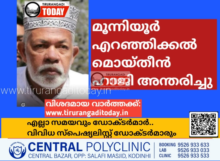 മൂന്നിയുർ: ചിനക്കൽ പുളിച്ചേരിയിലെ പൗരപ്രമുഖനും മുസ്ലിം ലീഗിന്റെയും സമസ്തയുടെയും നേതൃനിരയിലെ സജീവ സാന്നിധ്യവും ദീർഘകാലം പ്രവാസിയുമായിരുന്ന പരേതനായ എറഞ്ഞിക്കൽ സൈതാലി ഹാജിയുടെ മകൻ മൊയ്ദീൻ ഹാജി (65)നിര്യാതനായി. സൗദി അറേബ്യയിലെ അല്ലീത്തിൽ ബിസിനസായിരുന്നു. ഭാര്യ തുടിശ്ശേരി സഫിയ.
