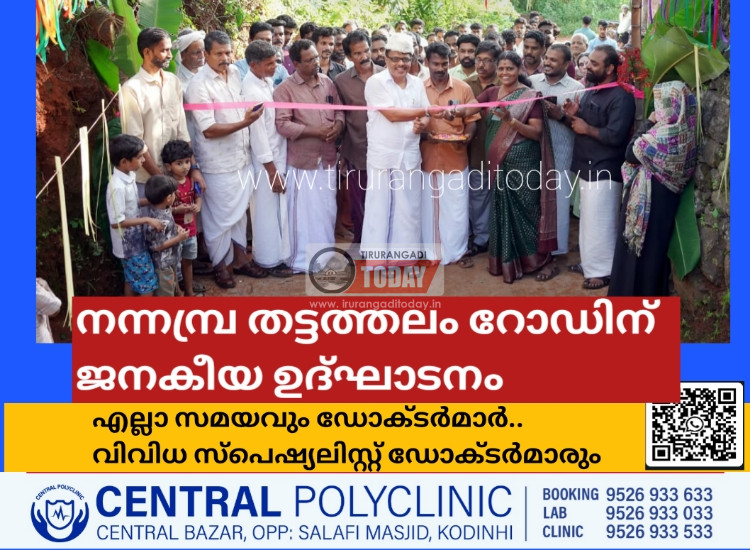 നന്നമ്പ്ര പഞ്ചായത്തിലെ നാല് പതിറ്റാണ്ടിലേറെ പഴക്കമുള്ള നവീകരിക്കാതെ രാഷ്ട്രീയ അവഗണനയിലായിരുന്ന 16ാം വാർഡിലെ തറയിൽ താഴം തട്ടത്തലം റോഡ് ജനകീയ വിഷയമായി ഏറ്റെടുത്തുകൊണ്ട് 120 മീറ്റർ നീളമുള്ള റോഡ് വാർഡ്മെമ്പർ ടി പ്രസന്നകുമാരിയുടെ നേതൃത്വത്തിൽ ജനകീയമായി കോൺക്രീറ്റ് ചെയ്തു ഗതാഗതയോഗ്യമാക്കി. ജനകീയമായി സംഘടിപ്പിച്ച ചടങ്ങിൽ റോഡ് വാർഡ് മെമ്പർ ടി.പ്രസന്നകുമാരി പൊതുജനങ്ങൾക്കായി തുറന്നു കൊടുത്തു. മുഖ്യാതിഥിയായി ബിജെപി സംസ്ഥാന സമിതി അംഗം സയ്യിദ് ബാദുഷ തങ്ങൾ, മണ്ഡലം പ്രസിഡണ്ട് റിജു സി രാഘവ്, വാസു കൊടിഞ്ഞിയത്ത്, ഷാജൻ വി വി, ഉദയകുമാർ സി, പരമേശ്വരൻ മച്ചിങ്ങൽ, മുഹമ്മദ് അലി എൻ, സുബ്രഹ്മണ്യൻ കെ, ഷാഫി എൻ, റഹീം എൻ, രാഘവൻ പി, വിനീത് കെ, സൈദലവി സിപി, വർഡ് കോഡിനേറ്റർ മധുസുദൻ എന്നിവർ സംസാരിച്ചു