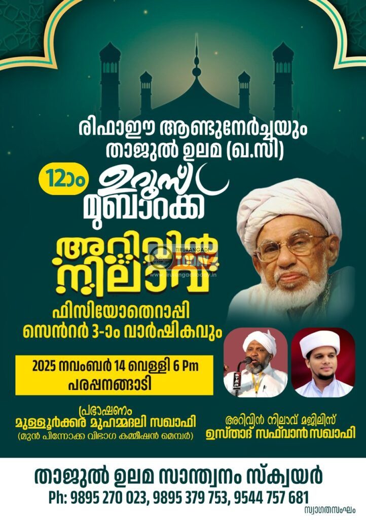 രിഫാഇ ആണ്ട് നേർച്ചയും താജുൽ ഉലമ ഉറൂസ് മുബാറക്ക് അറിവിൻ നിലാവ് മജ്‌ലിസും നാളെ
