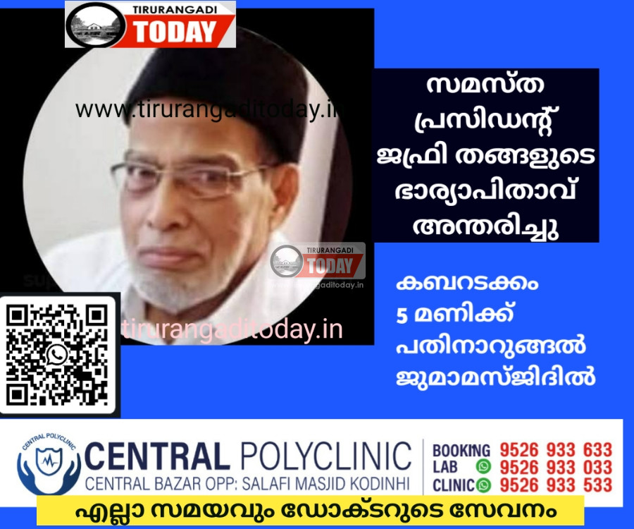 സ്വദേശി സയ്യിദ് ഫള്ൽ ജമലുല്ലൈലി കുഞ്ഞി തങ്ങൾ (90) അന്തരിച്ചു. സമസ്ത അധ്യക്ഷൻ സയ്യിദ് മുഹമ്മദ് ജിഫ്രി മുത്തുക്കോയ തങ്ങളുടെ ഭാര്യ പിതാവാണ്. ഖബറടക്കം ഇന്ന് വൈകിട്ട് 5 മണിക്ക് പന്താരങ്ങാടി ജുമാ മസ്ജിൽ.
