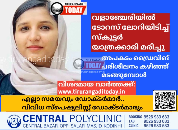 സ്കൂട്ടർ മറികടക്കാൻ ശ്രമിക്കുന്നതിനിടെ ടോറസ് ലോറിയുമായി കൂട്ടിയിടിക്കുകയായിരുന്നു എന്നാണ് പ്രാഥമിക വിവരം. അപകടത്തിൽ സ്കൂട്ടർ യാത്രികയായ എളയമ്പറമ്പിൽ റഫീഖിന്റെ ഭാര്യ ജംഷീന (27) ആണ് സംഭവ സ്ഥലത്ത് വെച്ച് തന്നെ മരണപ്പെട്ടത്.