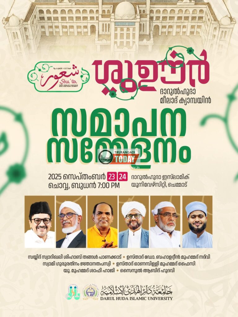 സമാപന സമ്മേളനം വാഴ്സിറ്റി ചാന്സലര് പാണക്കാട് സയ്യിദ് സ്വാദിഖലി ശിഹാബ് തങ്ങള് ഉദ്ഘാടനം ചെയ്യും. വൈസ് ചാന്സലര് ഡോ. ബഹാഉദ്ദീന് മുഹമ്മദ് നദ്വി അധ്യക്ഷനാകും. സ്വാമി ഗുരുരത്നം ജ്ഞാനതപസ്വി മുഖ്യാതിഥിയാകുന്ന പരിപാടിയില് ഓണമ്പിള്ളി മുഹമ്മദ് ഫൈസി മുഖ്യപ്രഭാഷണം നടത്തും. ഇശ്ഖ് മജ്ലിസിന് സൈനുല് ആബിദീന് ഹുദവി ചേകന്നൂര് നേതൃത്വം നല്കും.