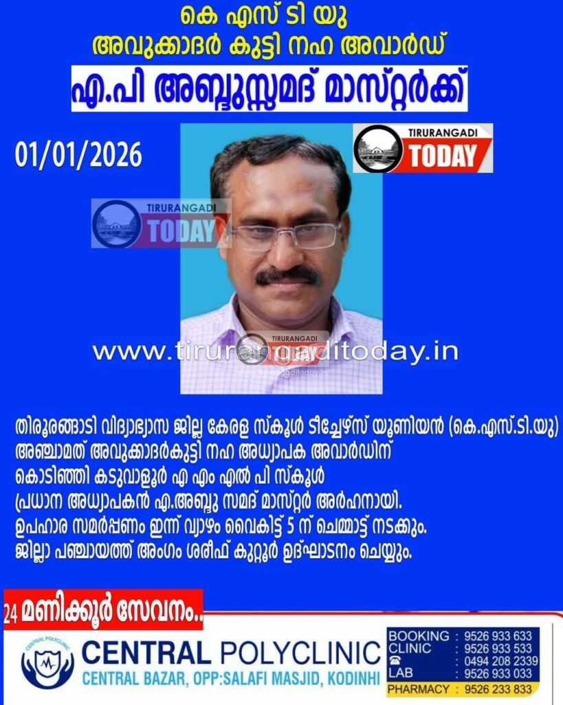 തിരൂരങ്ങാടി: വിദ്യാഭ്യാസ ജില്ല കേരള സ്കൂൾ ടീച്ചേഴ്സ് യൂണിയൻ (കെ.എസ്.ടി.യു) അഞ്ചാമത് അവുക്കാദർകുട്ടി നഹ അധ്യാപക അവാർഡിന് താനൂർ ഉപജില്ലയിലെ കൊടിഞ്ഞി കടുവാളൂർ എ എം എൽ പി സ്കൂൾ പ്രധാന അധ്യാപകൻ എ. അബ്ദു സമദ് മാസ്റ്റർ അർഹനായി. ഉപഹാര സമർപ്പണം ഇന്ന് വ്യാഴം വൈകിട്ട് അഞ്ചിന് ചെമ്മാട്ട് നടക്കും. ജില്ലാ പഞ്ചായത്ത് അംഗം ശരീഫ് കുറ്റൂർ ഉദ്ഘാടനം ചെയ്യും. കെ എസ് ടി യു വാർഷിക കൗൺസിൽ മീറ്റ്, പുതിയ വർഷത്തേക്കുള്ള ഭാരവാഹികളുടെ തിരഞ്ഞെടുപ്പ് എന്നിവയും ഇതോടനുബന്ധിച്ച് നടക്കും.