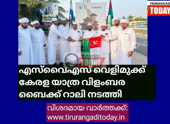 മുന്നിയൂർ: എസ്.വൈ.എസ് വെളിമുക്ക് സർക്കിൾ കമ്മിറ്റിക്ക് കീഴിൽ കേരളയാത്രയുടെ ഭാഗമായി വിളംബര ബൈക്ക് റാലി നടത്തി.പാലക്കൽ നിന്നും ജമലുല്ലൈലി മഖാം സിയാറത്തോടെ പ്രയാണമാരംഭിച്ച് ആലുങ്ങൽ, കൂഫ, വെളിമുക്ക്, തലപ്പാറ, മുട്ടിച്ചിറ, UHനഗർ,MHനഗർ വഴി കളിയാട്ടമുക്കിൽ സമാപിച്ചു. കേരള മുസ്ലിം ജമാഅത്ത് സെക്രട്ടറി ശരീഫ് വെളിമുക്ക് സർക്കിൾ കമ്മിറ്റിക്ക് പതാക കൈമാറി ഉദ്ഘാടനം ചെയ്തു.വെളിമുക്ക് മുസ്ലിം ജമാഅത്ത് സെക്രട്ടറി അബ്ദുറഹ്മാൻ മുസ്ലിയാർ കൂഫ , ഇസ്ഹാഖ് സഖാഫി, റാഫി സഖാഫി, സയ്യിദ് സ്വാദിഖലി തുറാബ് തങ്ങൾ, മലിക് സഖാഫി,ശരീഫ് സഖാഫി ,മുഹമ്മദ് ശാഫി, മുഹമ്മദ് സ്വാബിർ ,മുഹമ്മദ് ശാമിൽ, തമീം റാസി എന്നിവർ സംബന്ധിച്ചു. യൂണിറ്റുകളിൽ നിന്ന് കേരള മുസ്ലിം ജമാഅത്ത്, എസ് വൈ എസ് ,എസ് എസ് എഫ് പ്രവർത്തകർ പങ്കെടുത്തു.