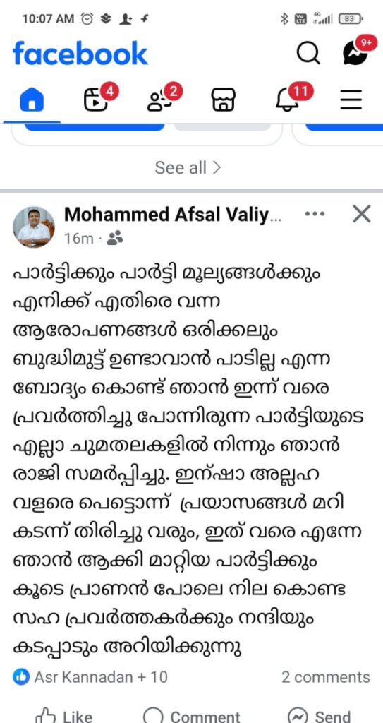 രാജി നൽകിയ വിവരം അഫ്സലും സമൂഹ മാധ്യമങ്ങൾ വഴി അറിയിച്ചിരുന്നു.