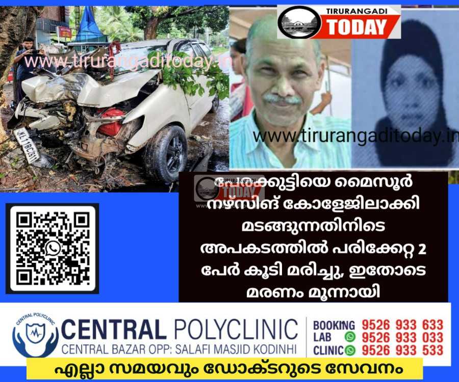 വണ്ടൂർ : കുട്ടിയെ മൈസൂരിൽ നഴ്സിങ് കോളേജിലാക്കി മടങ്ങുന്നതിനിടെയുണ്ടായ അപകടത്തിൽ പരിക്കേറ്റ 2 പേർ കൂടി മരിച്ചു. ഇതോടെ മരണം മൂന്നായി. കൂരാട് വരമ്പൻ കല്ലിലുണ്ടായ കാർ അപകടത്തിൽ ചികിത്സയിലായിരുന്ന പിതാവും മകളുമാണ് മരിച്ചത്. കഴിഞ്ഞദിവസം മരിച്ച മൈമൂനയുടെ ഭർത്താവ് ചെല്ലക്കൊടി കരിമ്പന കുഞ്ഞിമുഹമ്മദ് (66), മകൾ താഹിറ (40) എന്നിവരാണ് ഇന്ന് പെരിന്തൽമണ്ണ സ്വകാര്യ ആശുപത്രിയിൽ മരിച്ചത്. പേരക്കുട്ടിയെ മൈസൂരിൽ നഴ്സിങ് കോളജിൽ ആക്കി മടങ്ങിയ ഏഴംഗ കുടുംബം സഞ്ചരിച്ച കാർ ഇന്നലെ പുലർച്ചെ മരത്തിൽ ഇടിച്ചാണ് അപകടം ഉണ്ടായത്. അപകടത്തിൽ