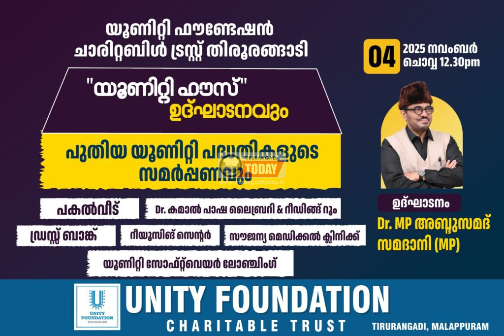 തിരൂരങ്ങാടി: തിരുരങ്ങാടി യൂണിറ്റി ഫൗണ്ടേഷന്റെ ആഭിമുഖ്യത്തിൽ വിവിധ പദ്ധതികളുടെ ഉൽഘാടനം നാളെ (ചൊവ്വ) 12:45 ന് എം പി അബ്ദുസമദാനി എം പി നിർവ്വഹിക്കുന്നു. യൂണിറ്റി പകൽവീട് പദ്ധതി, മുതിർന്ന പൗരന്മാർക്കും വീടകങ്ങളിൽ ഒറ്റപ്പെട്ടു കഴിയുന്നവർക്കും ഒത്തുചേരലിനും മാനസിക ഉല്ലാസത്തിനും