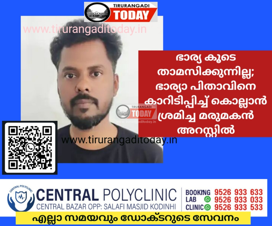 ഊർങ്ങാട്ടിരി : ഭാര്യ തന്റെ വീട്ടില് താമസിക്കാത്തതിന് കാരണം ഭാര്യാ പിതാവെന്ന് സംശയിച്ച്, കാറിടിപ്പിച്ച് ഭാര്യ പിതാവിനെ കാറിടിപ്പിച്ച് കൊല്ലാൻ ശ്രമം.